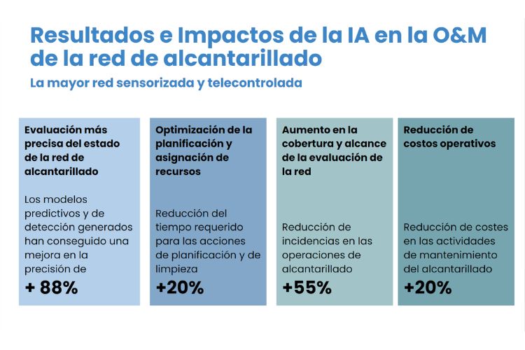 La aplicación de la IA permite la identificación temprana de problemas para poder realizar una planificación estratégica de recursos y coordinar las actividades de limpieza de alcantarillado. En este sentido, por ejemplo, los modelos predictivos y de detección generados han conseguido mejorar en un 88% la precisión en la evaluación de la red de alcantarillado. Por otro lado, el impacto de la IA también se traduce en una reducción del 55% de las incidencias en las operaciones de alcantarillado gracias al aumento en la cobertura y alcance de la evaluación de la red, en una reducción en un 20% del tiempo requerido para las acciones de planificación y limpieza, debido a la optimización de la asignación de recursos, y también en una disminución de costes en las actividades de mantenimiento del alcantarillado de un 20%.