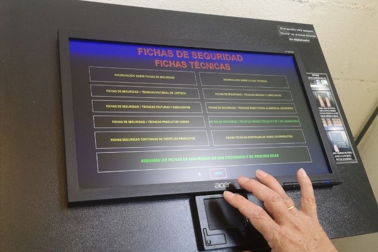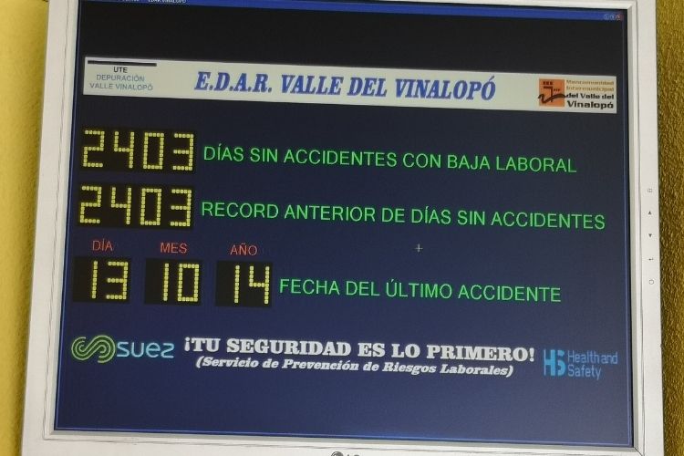 A esta solución se suman otras muchas que la plantilla ha ido desarrollando con el paso de los años: “Desde Aquambiente e Hidraqua siempre nos han apoyado con los medios económicos para poder desarrollar estas soluciones, aunque sí es verdad que también hemos recurrido al uso de materiales reciclados o a la reutilización de aparatos de los que ya disponíamos. Es una cuestión que forma parte de la filosofía de la empresa”. Así, por ejemplo, en puntos estratégicos de la instalación se han implantado pantallas que reproducen en continuo los mensajes sobre seguridad y salud; y se han construido pupitres informativos, a través de los cuales se pueden consultar todos los protocolos a seguir por el personal de planta en varios puntos de la instalación.